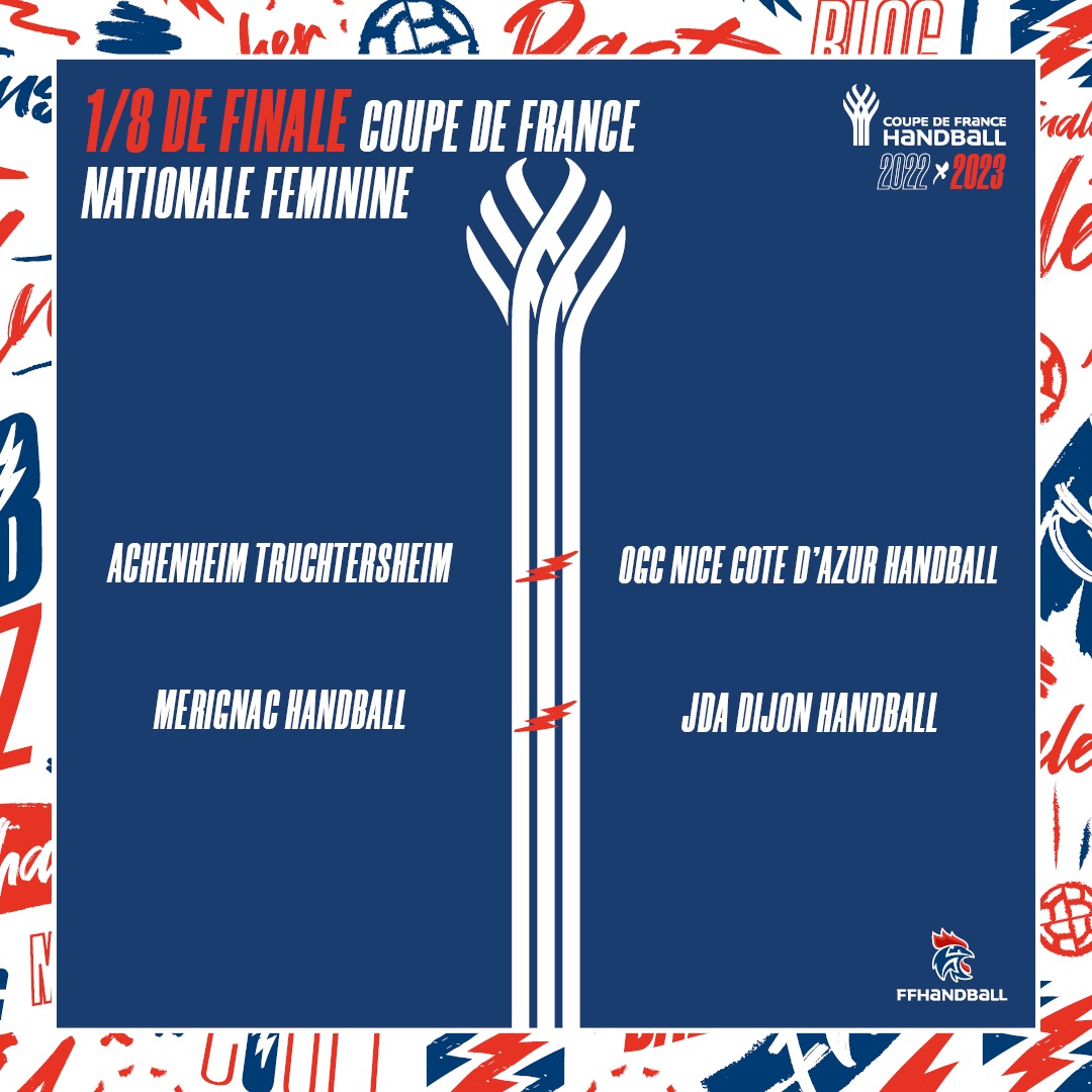 Le tirage des huitièmes de finale de la coupe de France féminine n’a pas fait long feu. Et pour cause, seuls quatre clubs sont en lice à ce stade de la compétition et chercheront à rejoindre les six clubs déjà qualifiés pour les quarts de finale. Les clubs engagés en Coupe d’Europe bénéficient en effet de cet avantage : une entrée en lice le mercredi 1er février pour Metz HB, Brest Bretagne HB, Chambray Touraine HB, l’ES Besançon, les Neptunes de Nantes et Paris 92. L’année 2023 débutera par deux chocs, les 7 et 8 janvier, avec Achenheim-Truchtersheim, unique club de D2F encore en lice, qui recevra l’OGC Nice pour rêver plus haut. L’autre match opposera deux équipes sociétaires de Ligue Butagaz Énergie : Mérignac HB et la JDA Dijon HB.