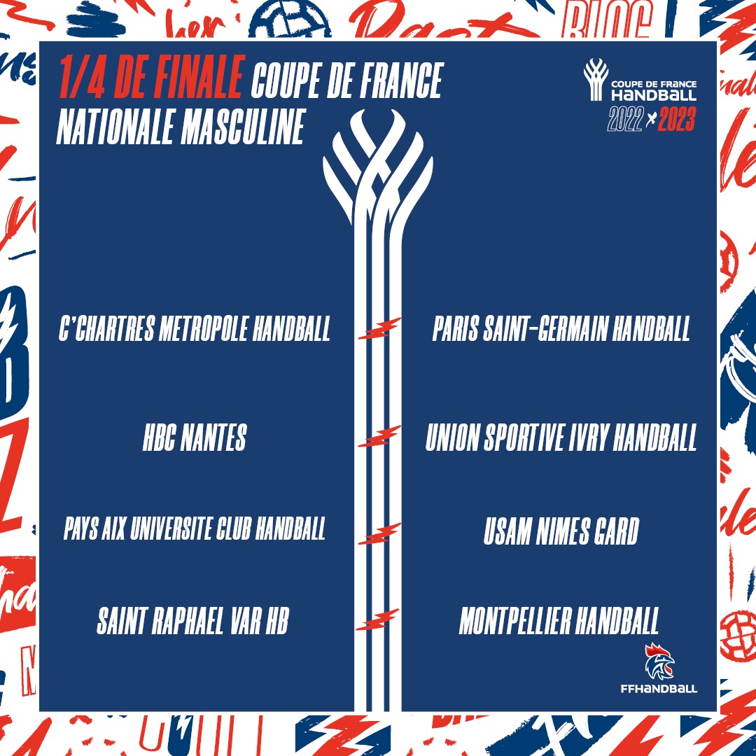 Après le Mondial masculin 2023 disputé en Pologne et en Suède et mobilisateur d’un grand nombre d’internationaux de Liqui Moly Starligue, la Coupe de France marquera le retour de l’élite masculine sur la scène nationale. Les quarts de finale proposent déjà un menu très alléchant avec quatre affiches attrayantes disputées les 4 et 5 février 2023. C’Chartres HB recevra ainsi le tenant du titre, le Paris Saint-Germain HB tandis que le finaliste de l’an passé, le HBC Nantes, accueillera l’US Ivry HB. Les deux autres rencontres vont générer aussi un bel engouement avec la capacité pour les supporters de soutenir leurs protégés. Le recordman de l’épreuve (13 victoires), le Montpellier HB, se rendra dans le Var pour défier les Raphaëlois tandis que l’USAM Nîmes Gard effectuera aussi un court déplacement vers Aix-en Provence pour défier le PAUC.