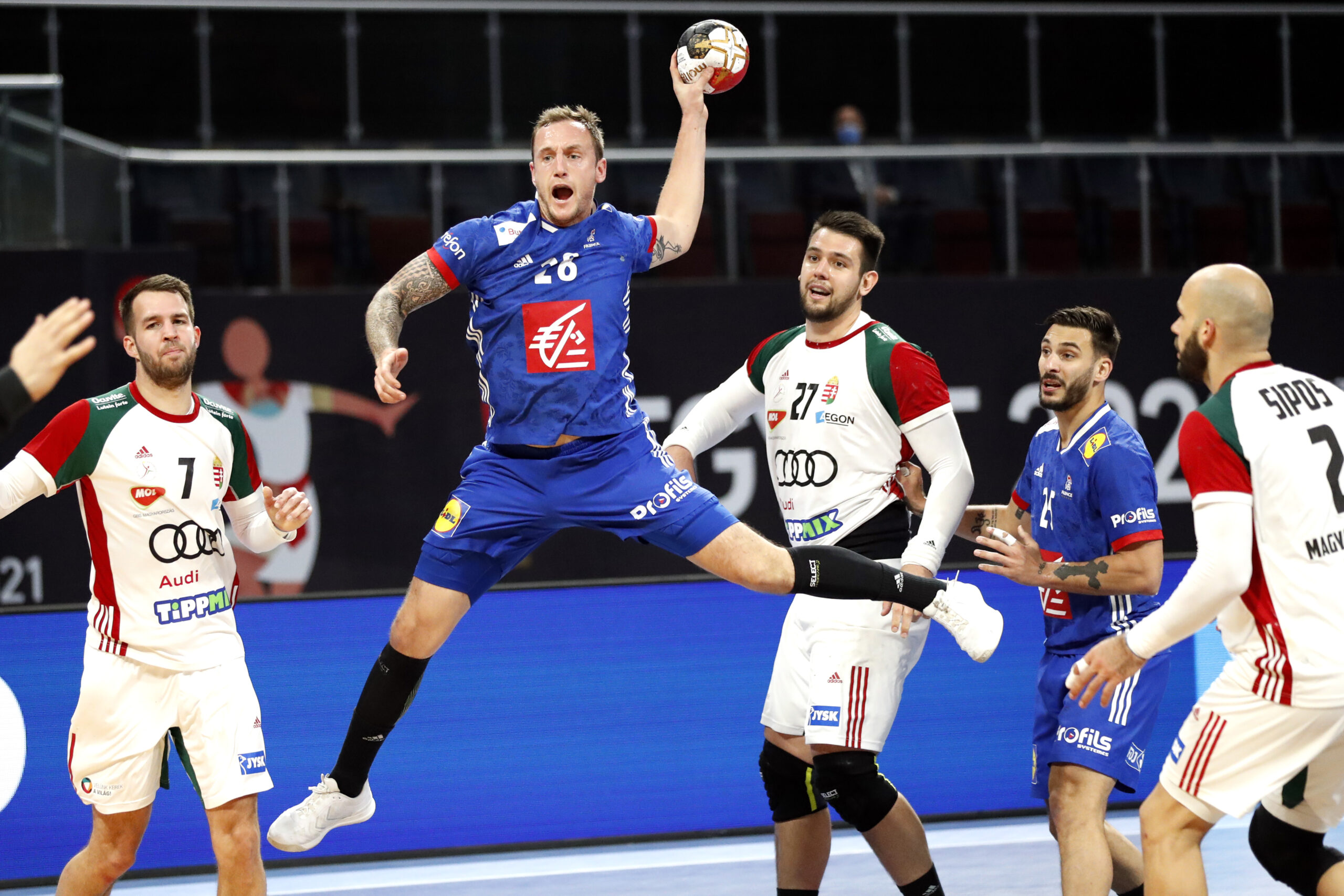 Le premier tir de Timothey N’Guessan est stoppé par Roland. Après seulement 60 secondes de jeu, Kentin Mahé écope d’une suspension de deux minutes. Dominik Mathé ouvre la marque. Zoltan Szita marque ensuite sur contre-attaque avant un tir trop enlevé de Timothey N’Guessan. Les Bleus réagissent enfin par l’intermédiaire de Ludovic Fabregas (1-2, 5e). La défense tricolore est mise à l’épreuve de la puissance magyare. Mate Lekai trompe la vigilance de Vincent Gérard et de l’autre côté, le gardien Roland Mikler stoppe un troisième tir. Mate Lekai frappe encore et offre le premier break de la partie à sa formation (1-4, 7e). Le portier hongrois réalise des prouesses : 5 arrêts sur 6 tirs. Nouvelle perte de balle tricolore, et Pedro Rodriguez s’en va inscrire le 5e but. Les hommes d’Istvan Gulyas débutent bien mieux la partie tandis que les Bleus n’y sont pas ! Bence Banhidi inscrit son premier but de la soirée puis Nedim Remili se retrouve seul face à Mikler mais le Parisien enlève trop son tir. Le score prend une ampleur inquiétante avec déjà 6 buts d’avance (7-1) en onze minutes. Les Bleus, après 7 minutes sans marquer, inscrivent enfin le second but par le capitaine Michaël Guigou. Bence Banhidi marque une seconde fois puis est exclu. Michaël Guigou inscrit le troisième but sur jet de 7m, d’un joli lob. Les maladresses s’enchaînent mais les Français parviennent tout de même à réduire l’écart au quart d’heure de jeu (5-9) et le 4e but de Michaël Guigou, consécutif au premier arrêt de Vincent Gérard. Que ce début de match est compliqué ! Après trois tentatives infructueuses, Nedim Remili marque enfin pour ramener son équipe à -3 (6-9, 19e). Les deux arrêts consécutifs de Vincent Gérard soulagent la défense tricolore bien plus compacte désormais. Mais c’est encore insuffisant car Roland Mikler évolue sur des standards très élevés : 9 arrêts sur 15 tirs (60 %). Nouvelle perte de balle magyare et c’est encore Michaël Guigou qui propulse le ballon dans les filets : 5 sur 5 pour le capitaine. Les Bleus se rapprochent encore un peu plus avec Nedim Remili mais les Hongrois, restés muets pendant 12 minutes, marquent leur 10e but par Bendeguz Boka. Luka Karabatic, bien servi par Romain Lagarde, relance sa formation (9-10, 23e) avant que Gabord Ancsin ne décoche un missile dans le but français. Melvin Richardson est entré sur le poste d’arrière droit tandis que Nedim Remili mène le jeu tricolore. Richard Bodo marque à son tour avant que les Bleus, par Ludovic Fabregas, reviennent à -2 (10-12, 26e). Michaël Guigou est encore décisif : il traverse le terrain pour marquer dans le but déserté. Après Mate Lekai (4 sur 4), c’est Luc Abalo qui inscrit son premier but de la soirée (12-13, 28e). Avec le 5e arrêt de Vincent Gérard, les Bleus sont en position d’égaliser : le moment choisi par Guillaume Gille pour poser son premier temps-mort. À 27 secondes du terme de cette première période, ce sont les Hongrois qui se rassemblent pour imaginer la meilleure stratégie pour déborder les Bleus. Romain Lagarde en fait les frais avec une exclusion (les Bleus débuteront la seconde période à 6) et Maté Lekai scelle le score, après 30 minutes, 14-12. Un moindre mal pour les Bleus qui ont compté jusqu’à 6 buts de retard. Luka Karabatic semble touché : il semble souffrir du flanc gauche.