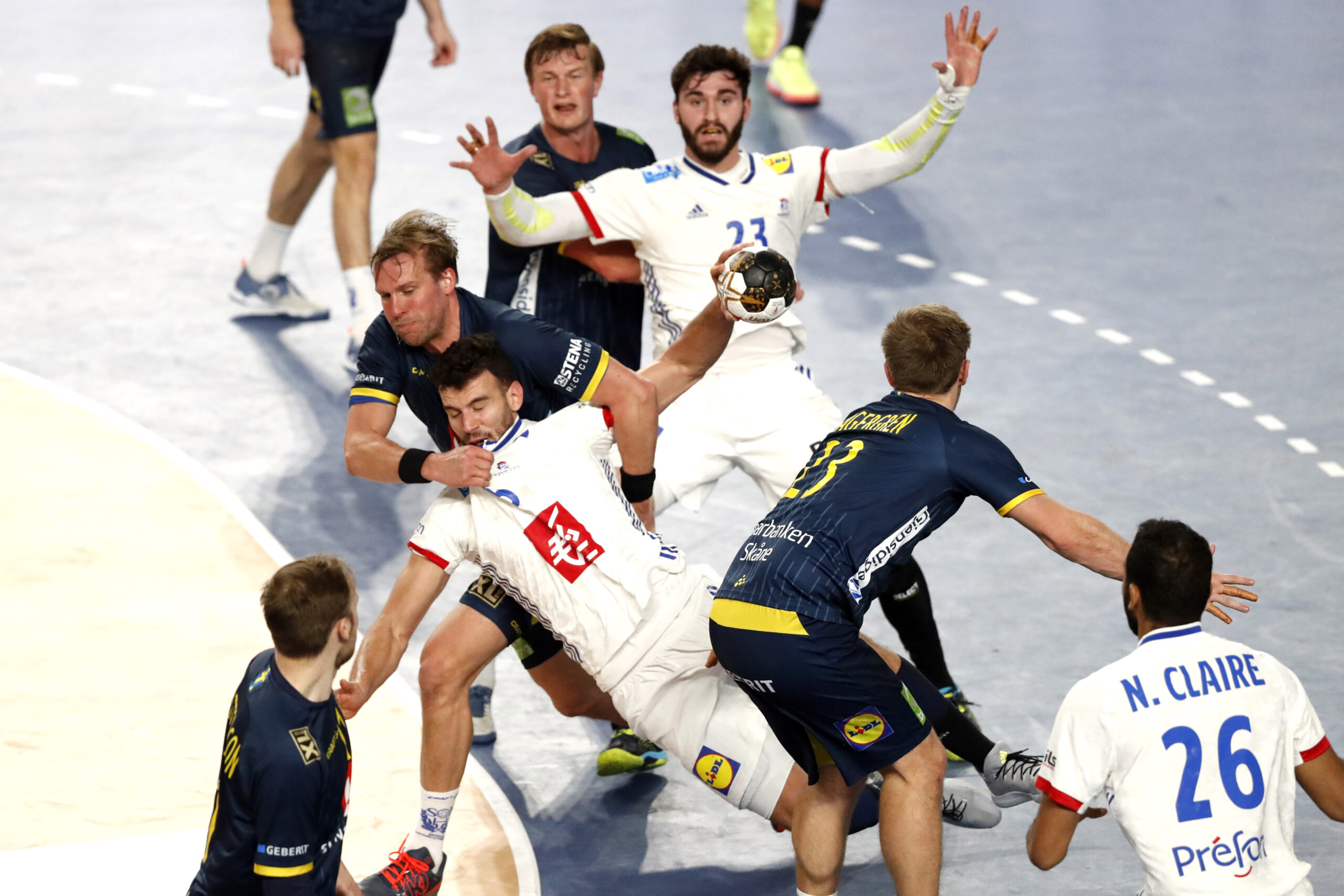 Le coup d’envoi est donné par la Suède qui ouvre la marque par Jonathan Carlsbogard. Ludovic Fabregas égalise aussitôt. La Suède mène désormais 2-1 (2e) avec le premier but de Jim Gottfridsson. Kentin Mahé orchestre l’attaque tricolore. Luc Abalo est sanctionné et doit quitter ses partenaires pour deux minutes. Hampus Wanne marque sur jet de 7m (1-3) avant que Dika Mem ne batte Andreas Palicka. La Suède est sanctionnée d’un passage en force mais les Bleus butent ensuite sur le portier suédois. Sur la contre-attaque, Daniel Petterson inscrit le 4e but scandinave. Nouvelle perte de balle suédoise et Dika Mem, s’illustre sur un kung-fu servi par Michaël Guigou. Jonathan Carlsbogard et Ludovic Fabregas marquent tour à tour : la Suède mène 5-4 après 10 minutes puis 6-4 grâce au second but de son ailier droit, Daniel Petterson. À l’autre bout de la diagonale, Luc Abalo réplique aussitôt pour maintenir les Bleus à distance raisonnable (5-6). L’ailier droit est ensuite servi par son pote de chambrée, le capitaine Guigou, pour tromper Palicka et égaliser : 6-6 dans cette première demi-finale avant l’autre choc entre l’Espagne et le Danemark. Ludovic Fabregas provoque un jet de 7m : Kentin Mahé positionne son équipe devant (7-6, 14e). Albin Lagergren égalise puis Hampus Wanne tire profit d’une perte de balle tricolore pour filer au but. La Suède mène 8-7 dans cette demi-finale disputée dans une salle immense et tristement vide.